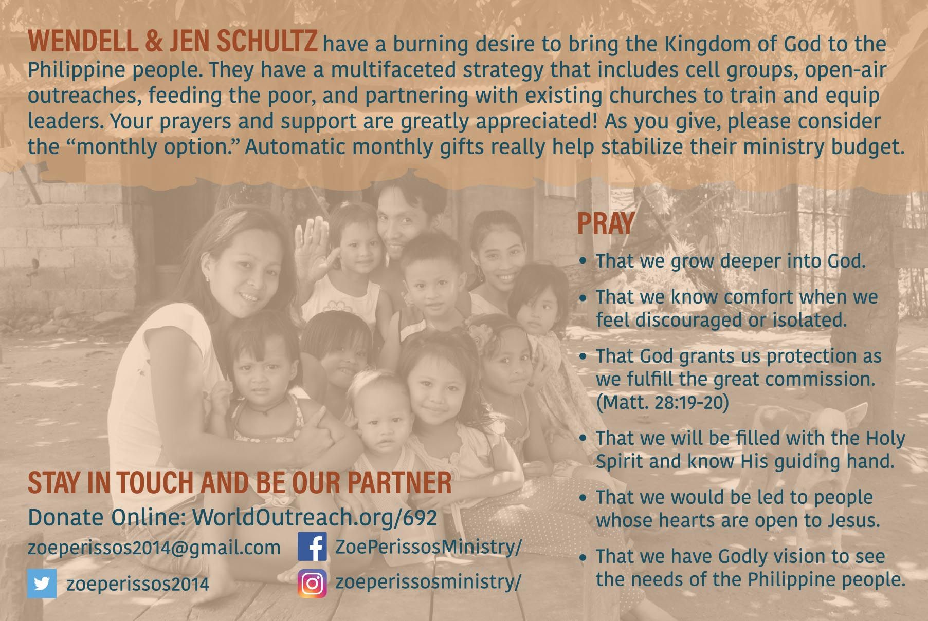 Wendell and Jennifer SchultzZoe Perissos MinistryDonate Page: www.WorldOutreach.org/692Email: [email protected]Website: https://zoeperissosministry.com/Facebook Page: https://www.facebook.com/ZoePerissosMinistry/Twitter: https://twitter.com/zoeperissos2014Instagram: https://www.instagram.com/zoeperissosministry/